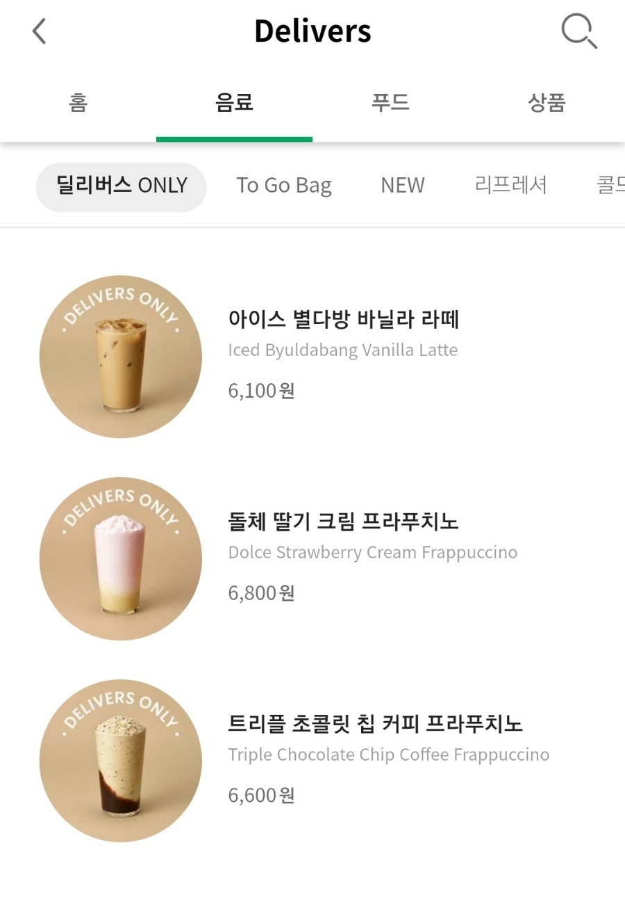 딜리버리온리 음료는 3가지 이고